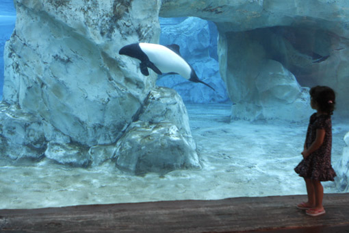 O ponto alto do Aquatica, que o diferencia dos demais parques, é o Dolphin Plunge. Depois de uma queda de 76 metros dentro de um tubo transparente, os visitantes passam dentro de uma lagoa onde “moram” golfinhos de uma espécie australiana. Reparem na imagem do menino dentro do tobogã vendo os golfinhos.