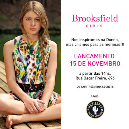 Sábado tem lançamento da marca Brooksfield Girls! A blogueira Niina Secrets vai participar do evento que contará com som do DJ Guilherme Guerrero.