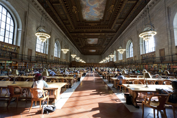 Na verdade, esta biblioteca é uma das bibliotecas públicas da cidade e é a localizada no edifício Stephen A. Schwarzman, de 1911. Vale pelo menos entrar para espiar a arquitetura de algumas salas como a Lionel Pincus and Princess Firyal Map Division e a sala principal, que é a General Research Division. Quando fomos, infelizmente, a sala Rose Main Reading Room, estava fechada.