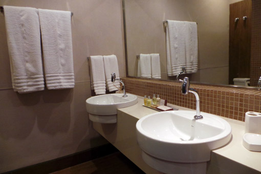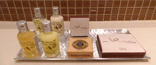 A cama do casal é king size e a TV tem Discovery Kids, o que ajudou a distrair as meninas em alguns momentos. As amenities são L`Occitane e cada suíte tem uma máquina de Nespresso. As cápsulas são cobradas à parte.