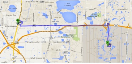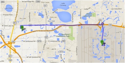 A loja Best Buy mais próxima do Aeroporto Internacional de Orlando fica no shopping Florida Mall. Do ponto A (Aeroporto) até o ponto B (Best Buy), o trajeto é relativamente simples e dura 15 minutos. Siga na avenida Jeff Fuqua Blvd, faça uma curva suave à esquerda na S Semoran Blvd para pegar a rampa de acesso para a FL-528 W. Este trecho tem pedágios. Fique atento aos pedágios da Florida, tenha trocado e de preferência moedas. As locadoras vão te oferecer os serviços de Express Toll Service que é o “Sem Parar” deles. Se tiver isso não precisa se preocupar com o troco. Os pedágios variam de 2 a 5 dólares. Pegue a saída 8 para a McCoy Road – Florida 482 sentido Sand Lake Road. Continue até pegar a Sand Lake Road e então vire à esquerda na Golden Sky Ln, vire à esquerda, a primeira à direita e direita novamente.