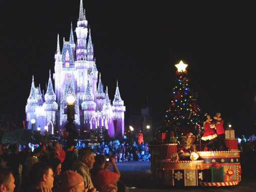 A parada é um desfile com os amados personagens da Disney. Eles passam ao vivo e pertinho dos visitantes do parque todos “vestidos de natal”.