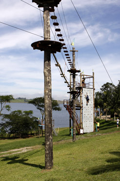 Outra coisa que eu gostei de fazer no Paradise foi pegar uma bicicleta com cadeirinha e dar a volta pelo resort. Foi assim que fotografei o campo de golfe e a represa. Um passeio bem gostoso. Ao chegar do passeio de bike fui conhecer a parte náutica do resort lá na represa. São pedalinhos e caiaques à disposição, mas eu já tinha cansado um pouco e preferi ir para piscina. Nesse caminho, fotografei a criançada na parede de escalada, mas nessa hora não tinha ninguém fazendo arvorismo.