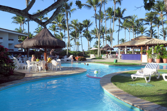 A área do resort é grande e, além das piscinas, tem quadras de tênis e poliesportiva, campo de futebol, pista de cooper, SPA, academia, salas de jogos, clubinho para crianças pequenas.