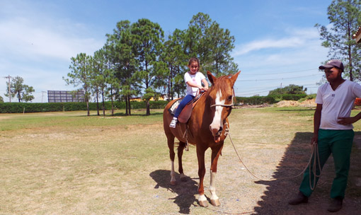 Outra coisa que as crianças gostam é de andar em uma charrete puxada por um pônei invocado e de andar a cavalo.